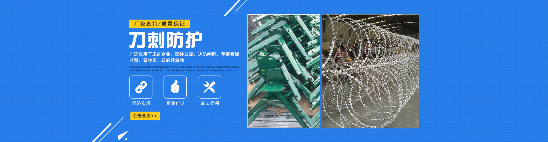 安平初日絲網有限公司主要產品有刀片刺繩、刺絲滾籠、刺繩支架、護欄網、隔離網、球場圍網等多種產品,公司擁有先進的生產設備和技術,以“質量求生存,信譽謀發(fā)展”為生產原則,為新老用戶提供高質量產品。